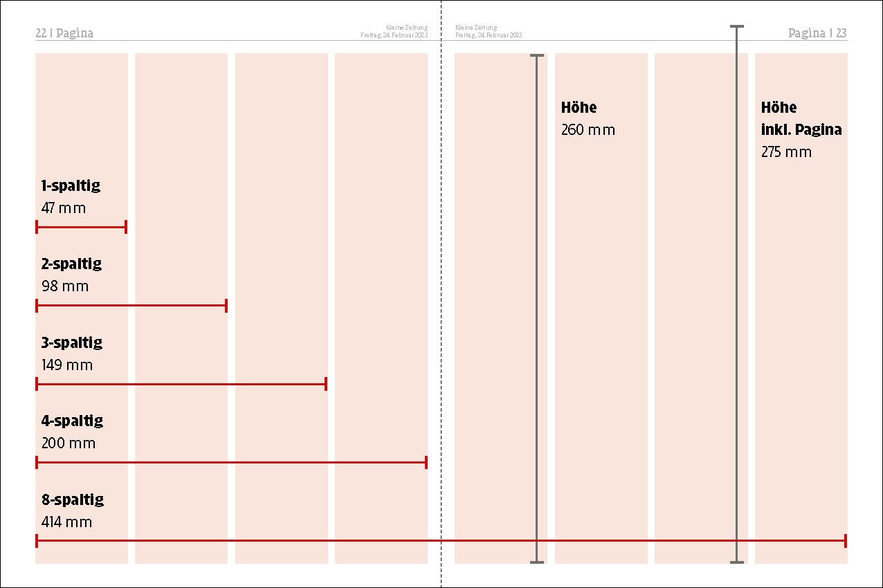 Der Satzspiegel der Kleinen Zeitung: 4 Spalten à 47 mm mit 4 mm Spaltenabstand ergeben eine Seitenbreite von 200 mm